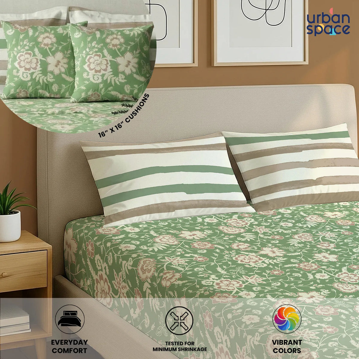 • Urban Space gives you a unique choice of coordinating your room decor in the designs of your liking, with bedsheet and cushion covers complimenting each other. Both the products are of 100% cotton giving a nice contrast touch to the room decor.