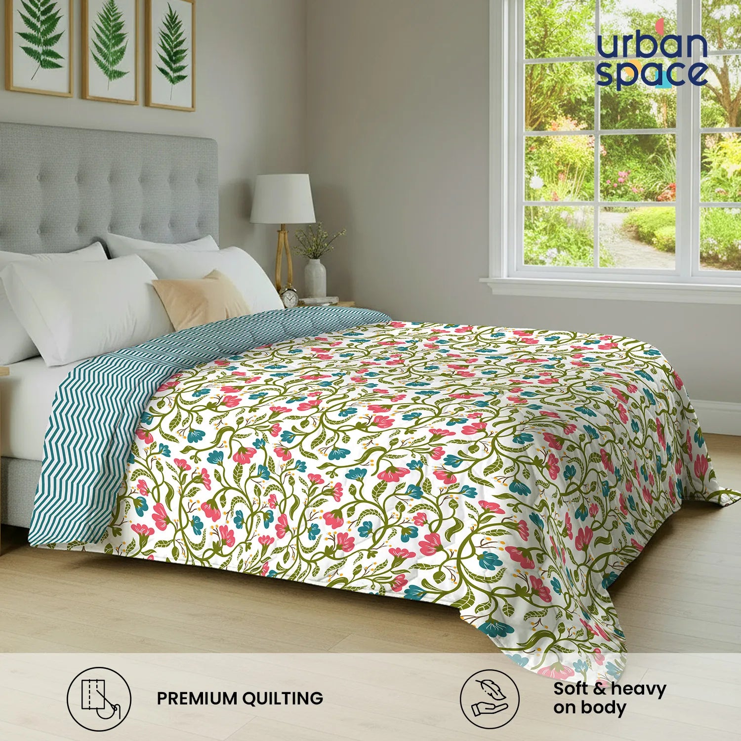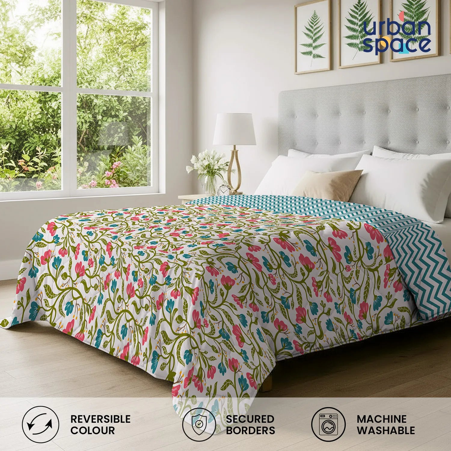 - Reversible Design: Features a reversible quilted design with dual-sided prints and colours, allowing you to switch styles effortlessly while maintaining a clean and well-finished bedding look.