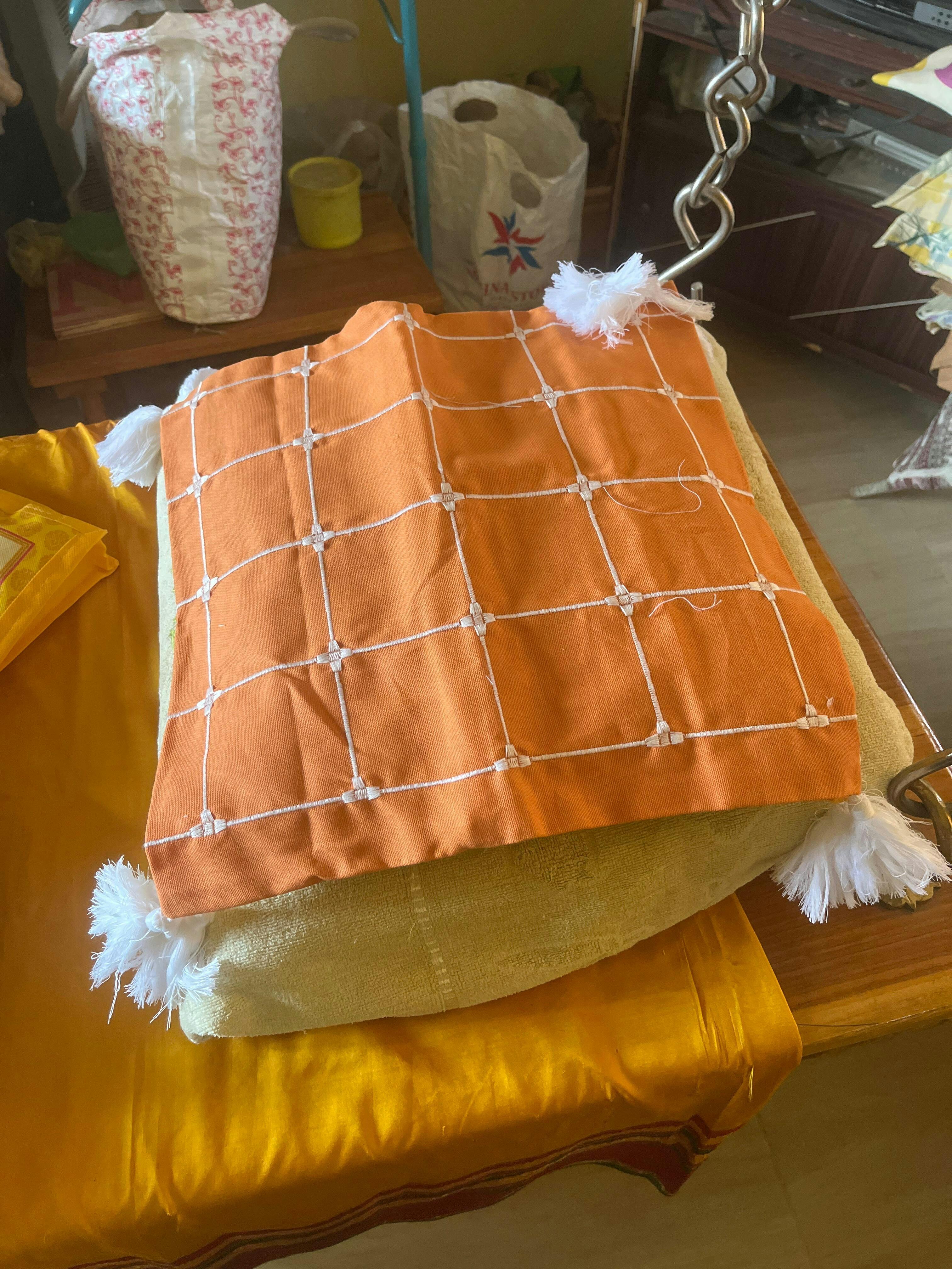 Embroidered Cotton Cushion Cover, for Sofa, Bedroom, Living Room - Set of 2 - Aura Checks Orange