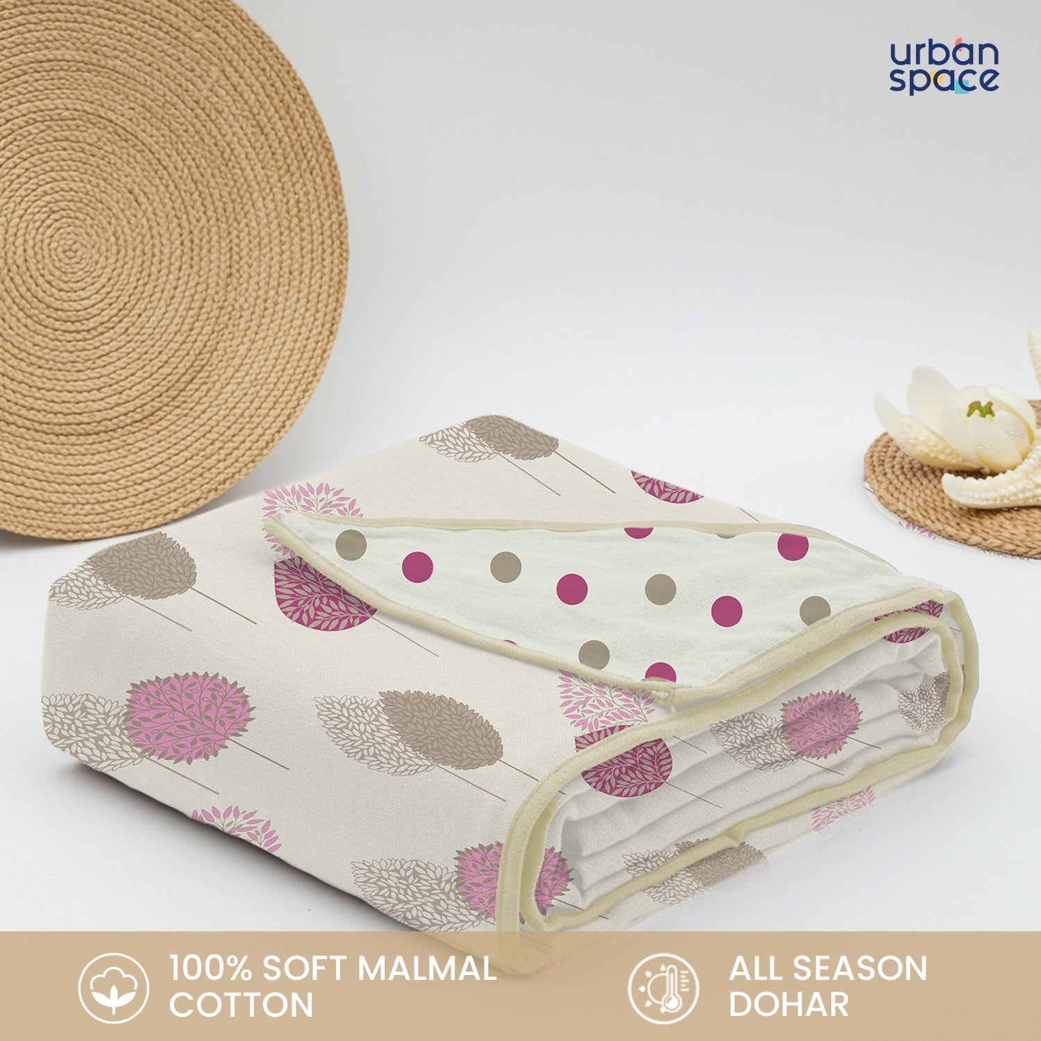 100% Malmal Cotton Blanket, Dohar, Quilt for AC and Light Winters - Drops Pink
