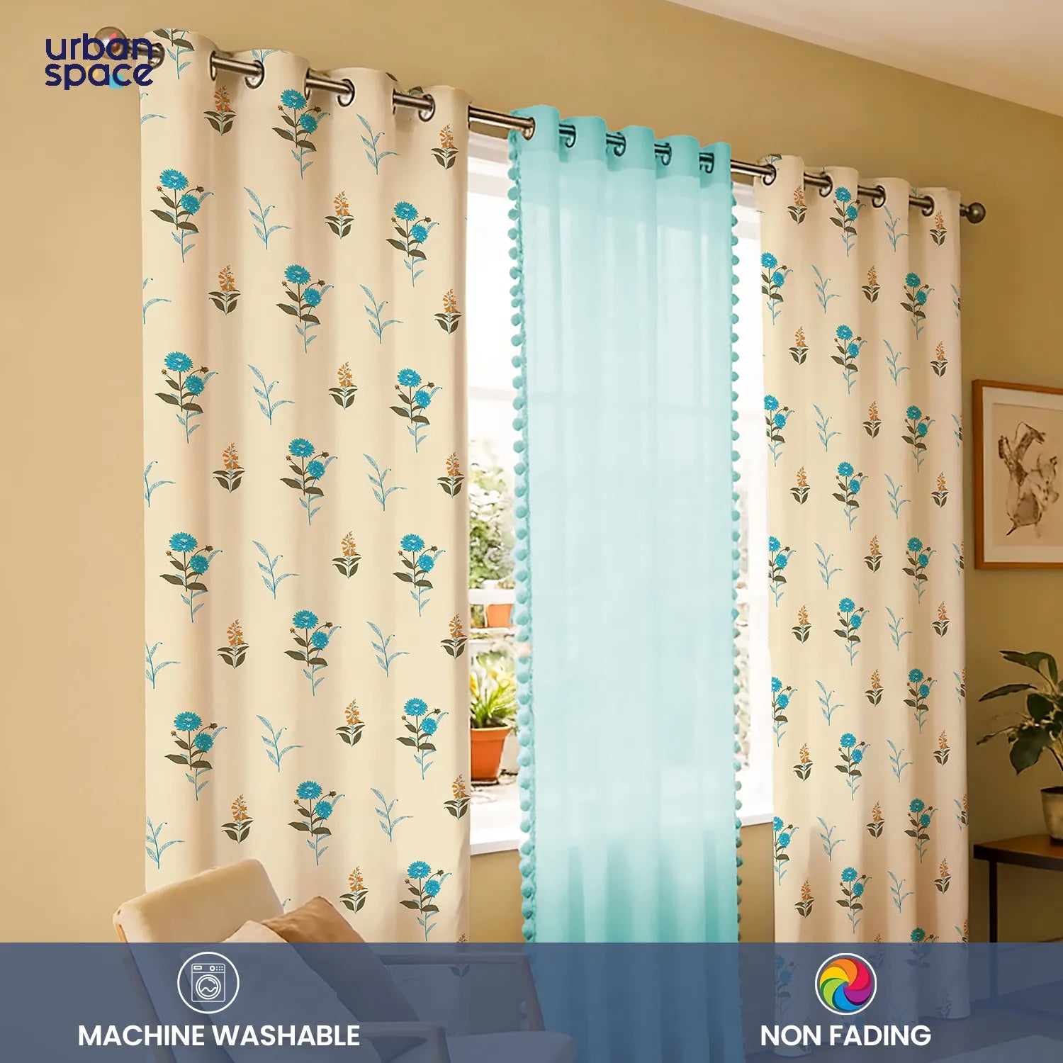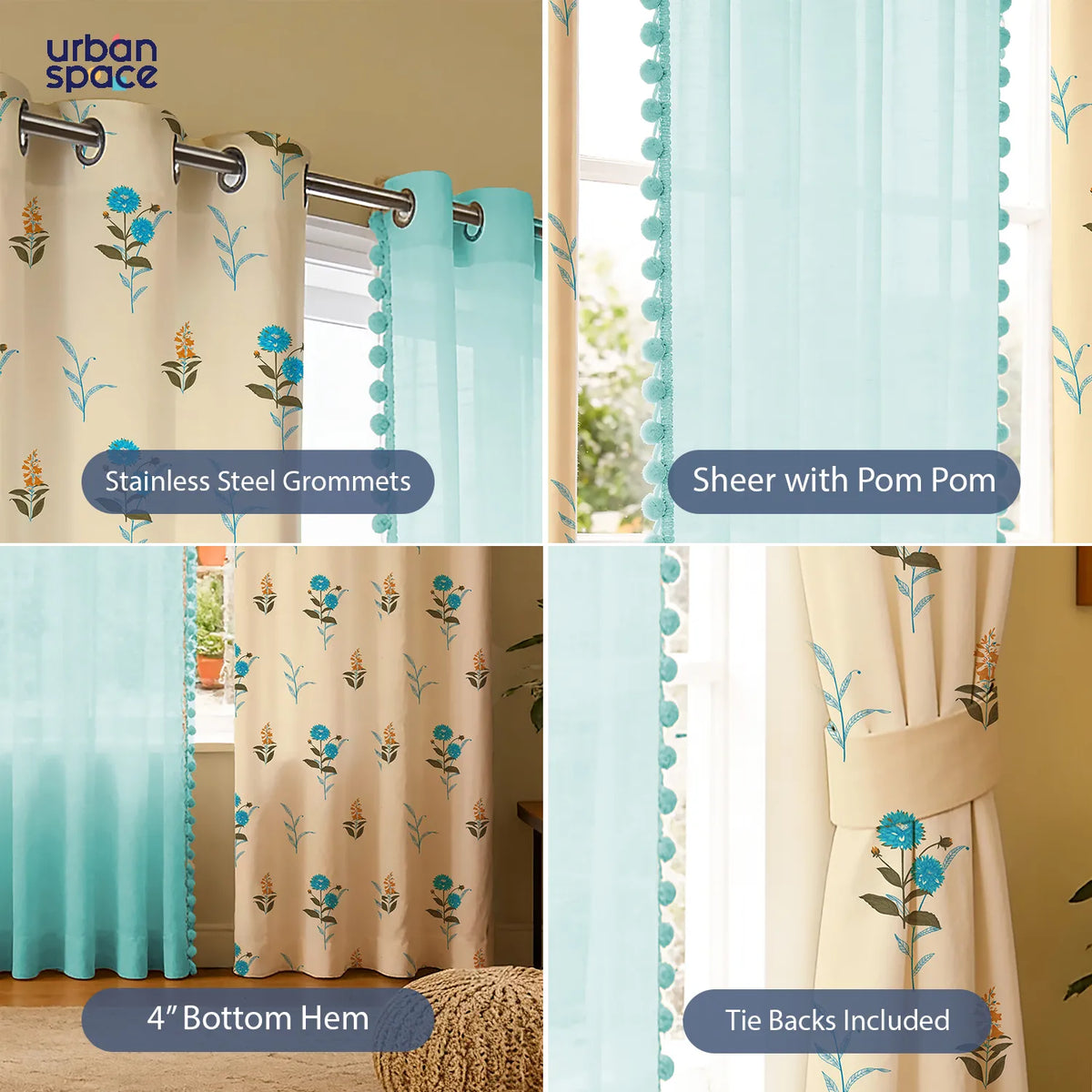 Cotton - Sheer Curtains Combo, Set of 3 curtains, 60-65% Room Darkening Curtain - Coneflower Blue & Aqua
