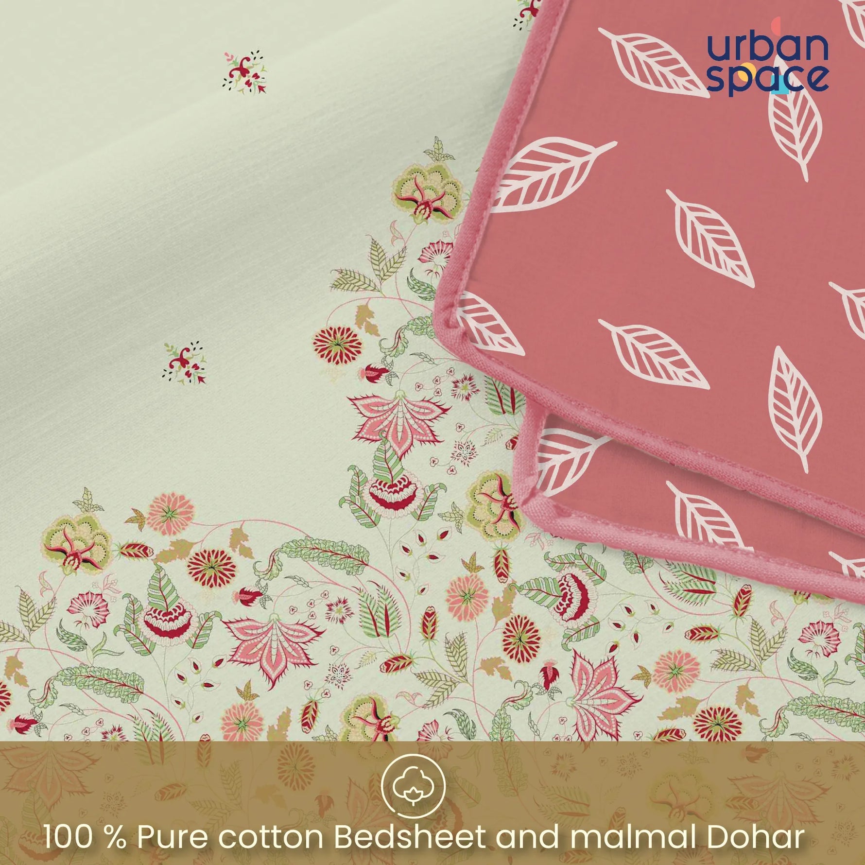 Cotton Bedsheet + Cotton AC Dohar Combo Pack - Vine Gardens Peach Pink