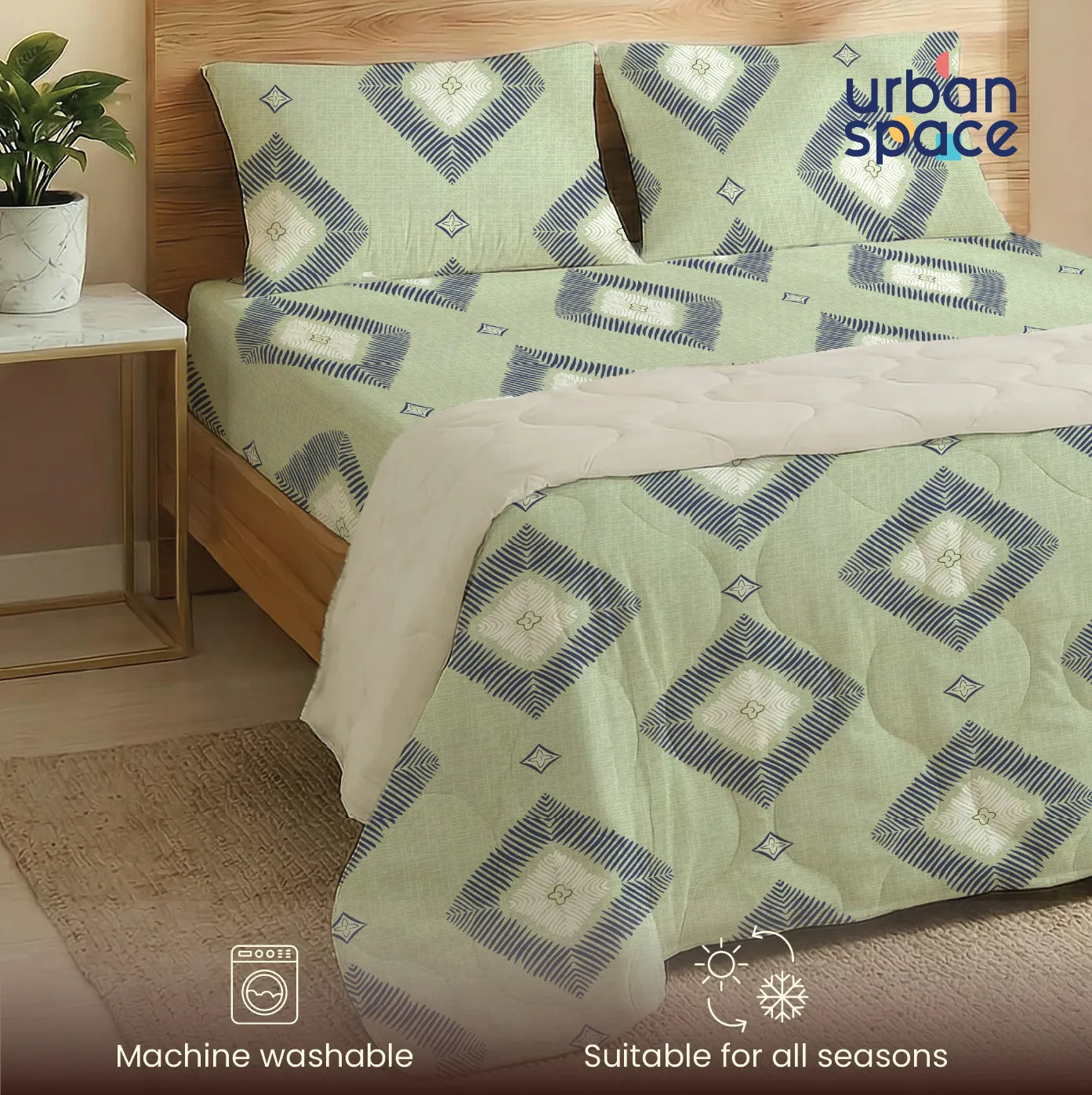 A perfectly matched combination of bedsheet and reversible blanket, eliminating the hassle of mixing and matching. Thoughtfully curated prints and coordinated pillow covers create a harmonious and stylish bedroom setup. The reversible blanket adds a subtle contrast touch, allowing you to refresh your décor effortlessly.