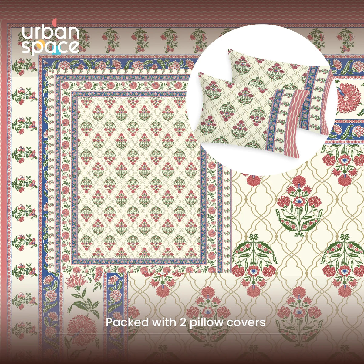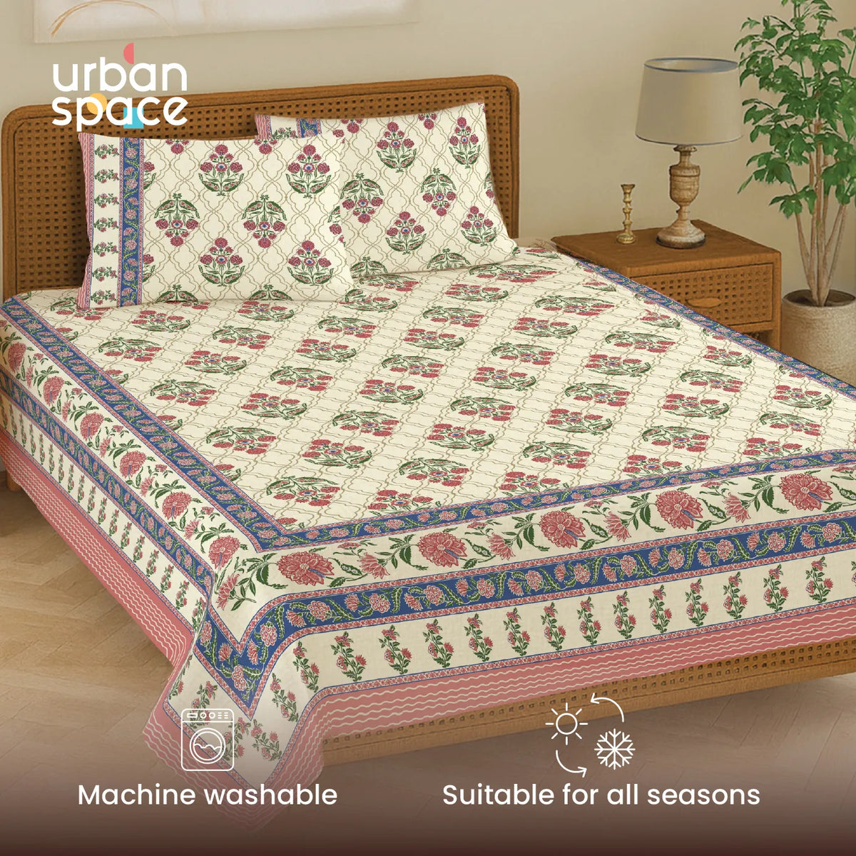 Rajasthani Ethnic 100% Cotton Bedsheet with 2 Pillow Covers - Amberjaal Pink