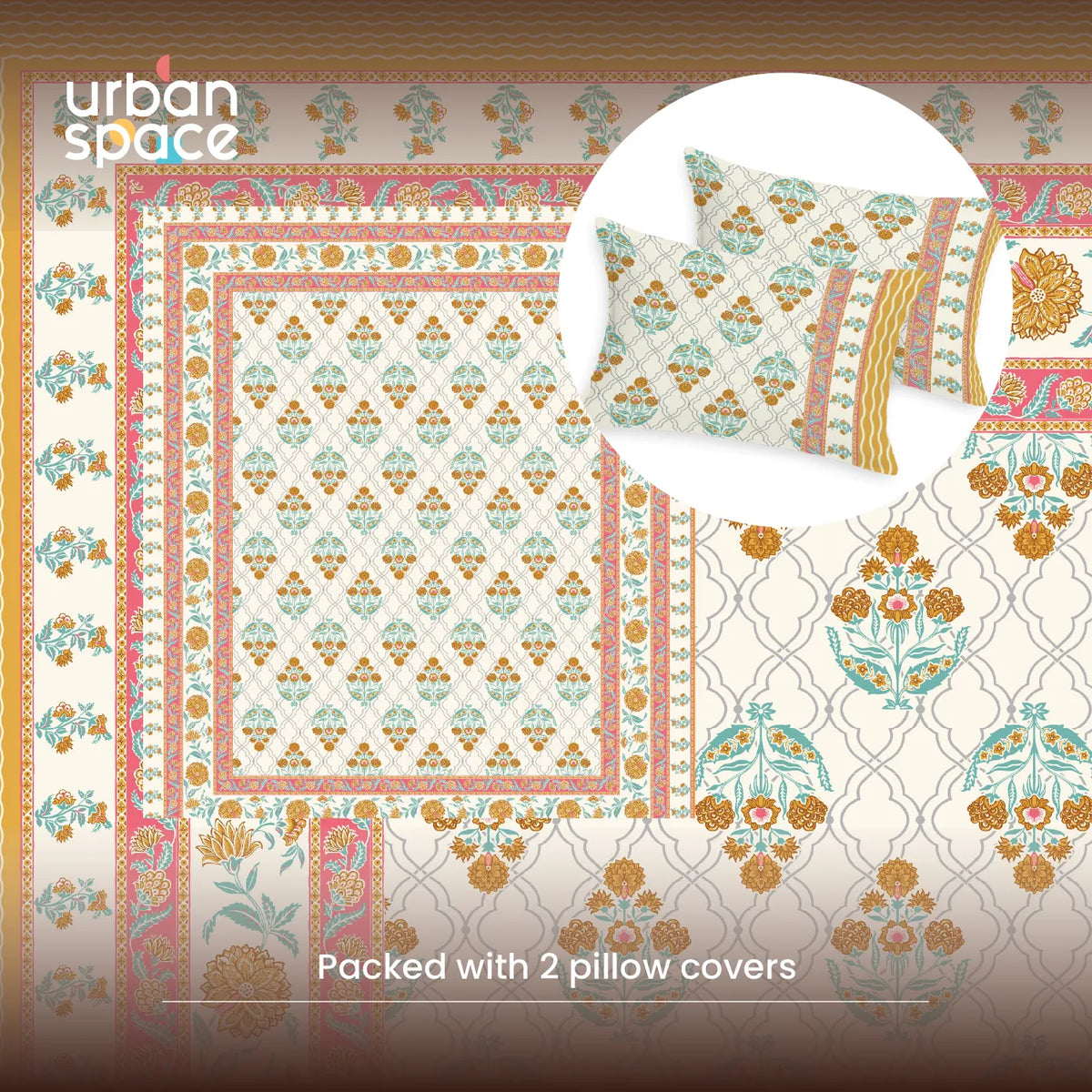 • Elegant 4-Side Border Design: Features detailed printed borders on all four sides that frame the bed beautifully and create a polished, styled appearance along with matching pillow covers.