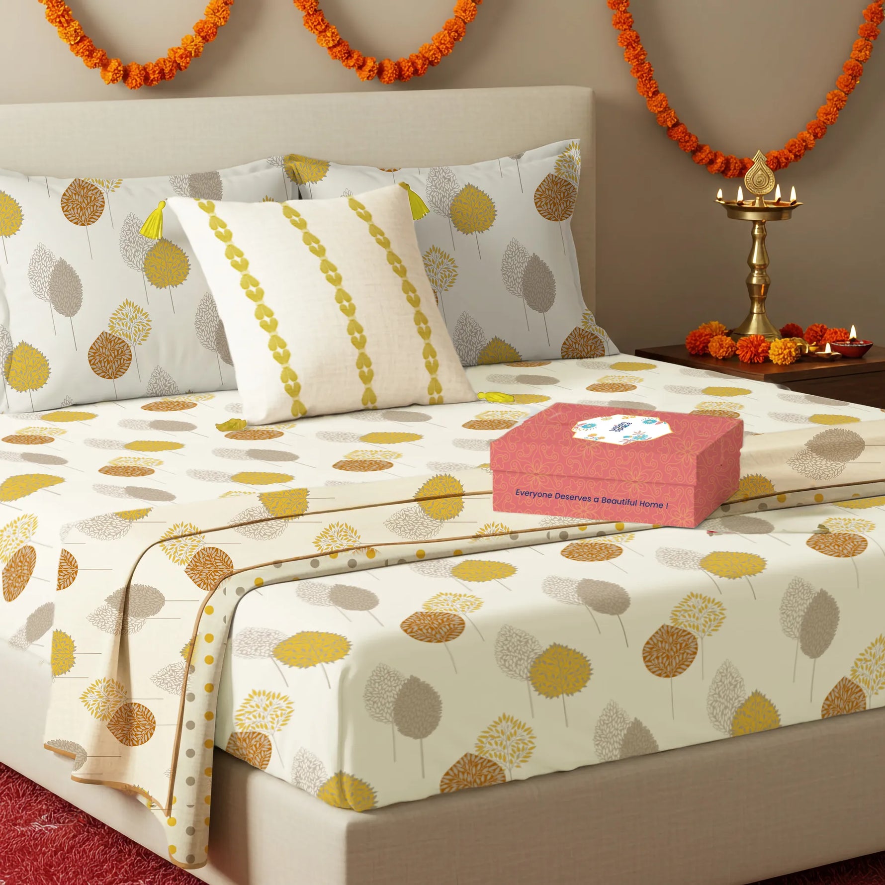 6 Pc Cotton Bedding Set in Gift Box, Drops Mustard