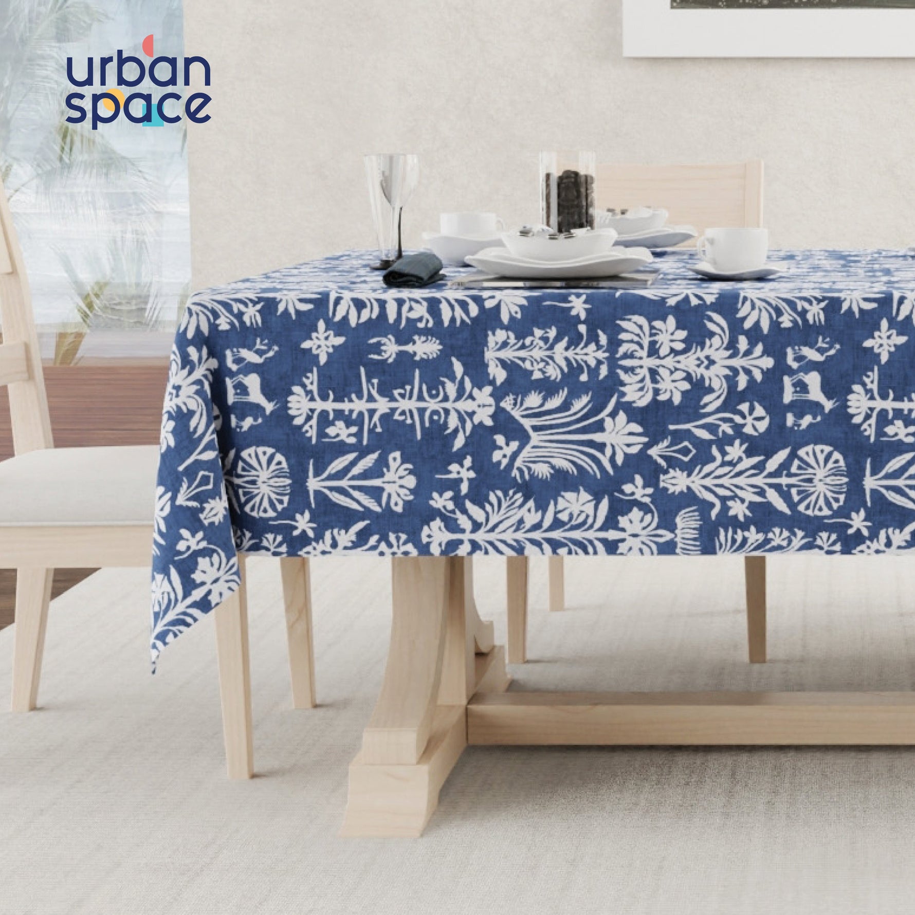Digital Printed Table Cover - Water Resistant, Full Size Table Cloth - Twigs Indigo Blue