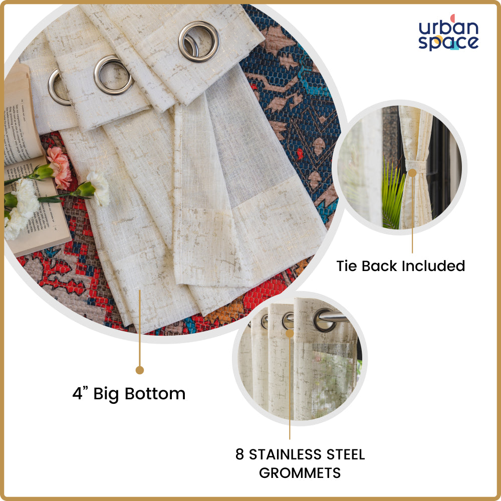 Linen Textured Metallic Gold Foil Sheer Curtains, Pack of 2 Curtains - Sparkle - Butter Cream