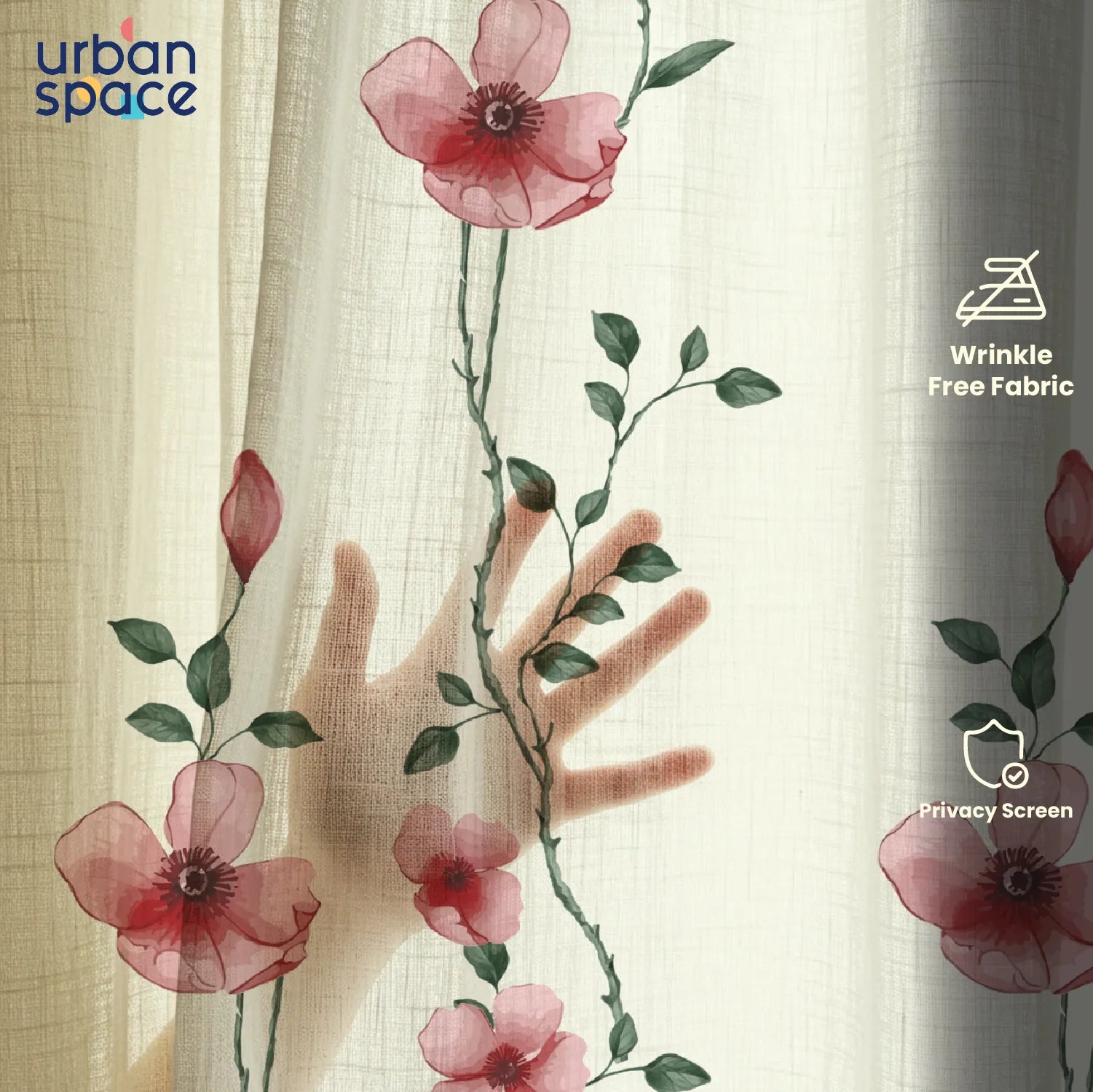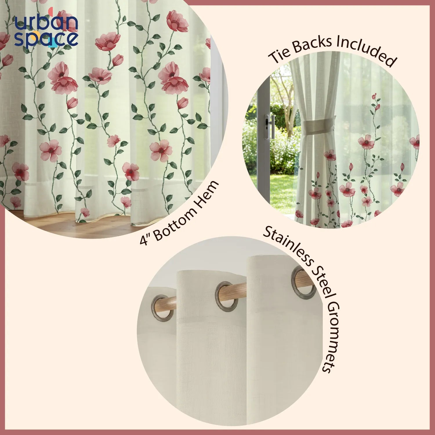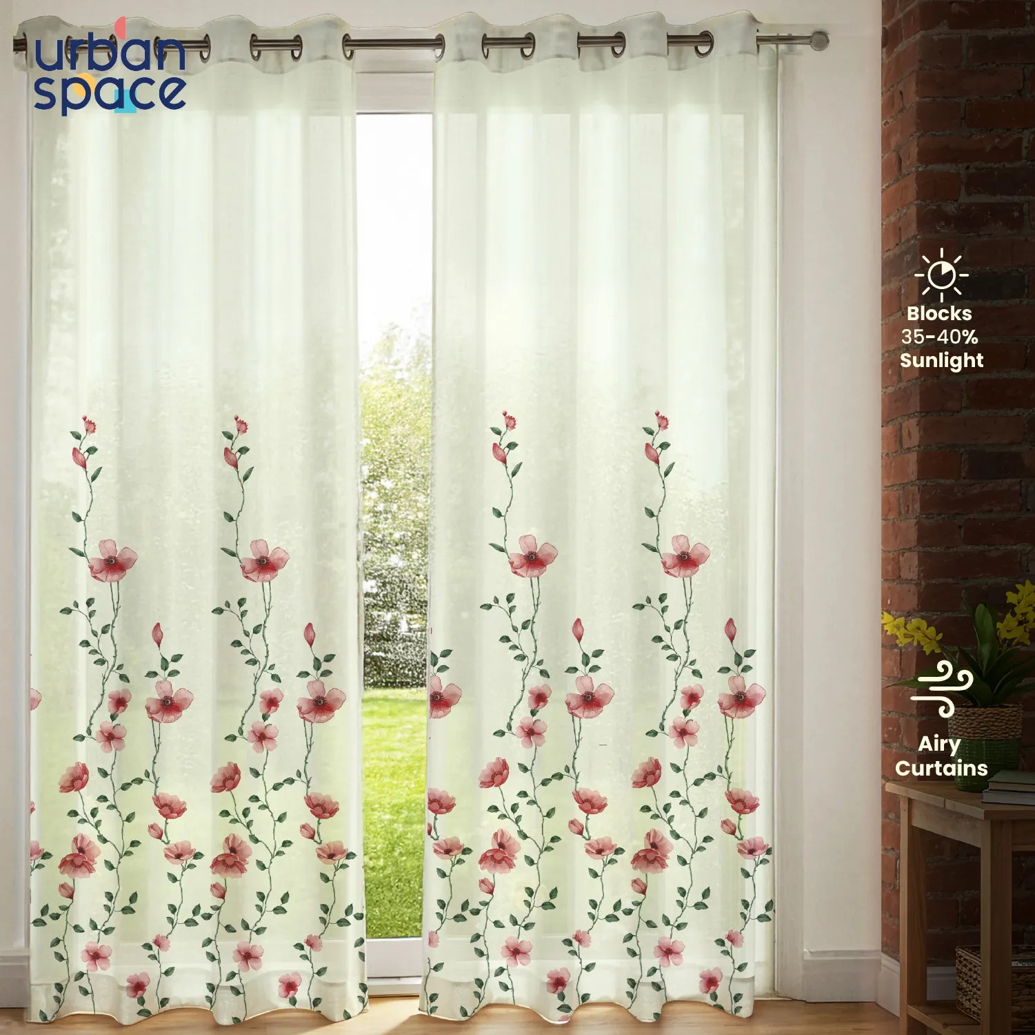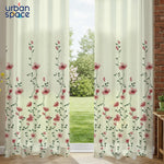 Sheer Curtains, Linen Textured & Digital Printed, Pack of 2 - Blush Vine
